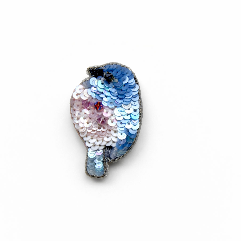 Broszka została wykonana techniką ręcznego haftu z użyciem włoskich cekinów, czeskich kryształów oraz bikonusów Swarovski, które nadają jej elegancki, szlachetny blask. Każdy detal został dopracowany z najwyższą precyzją.