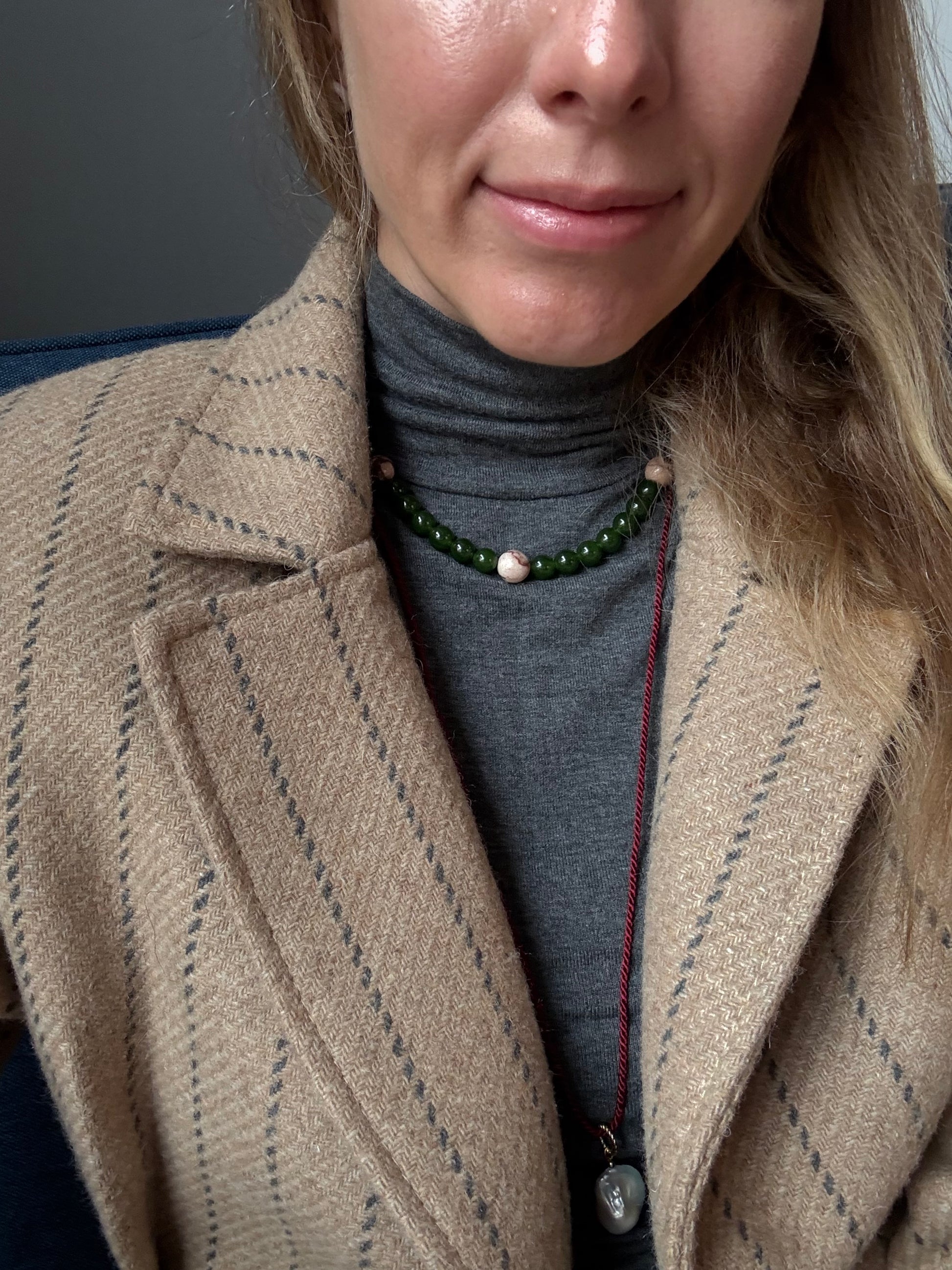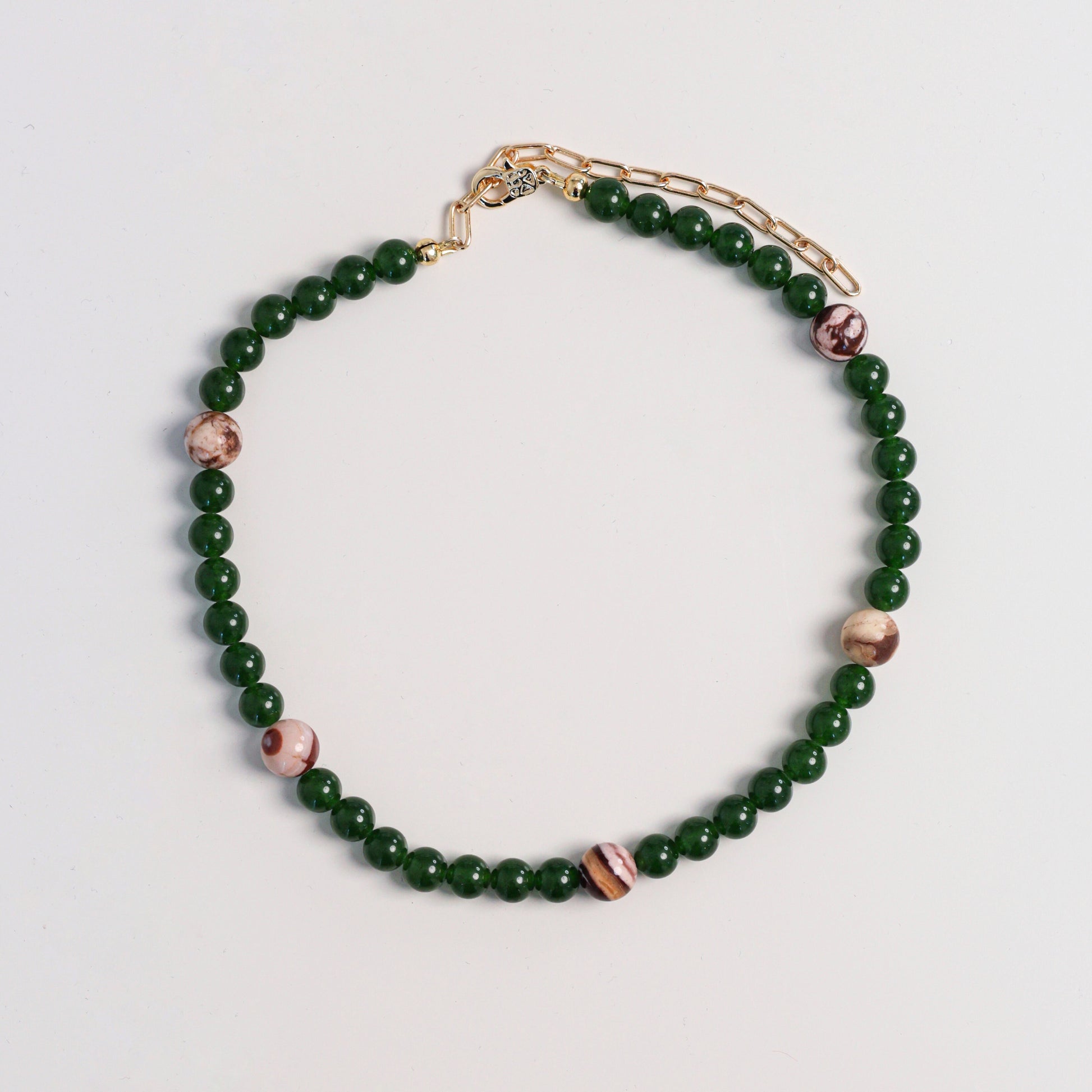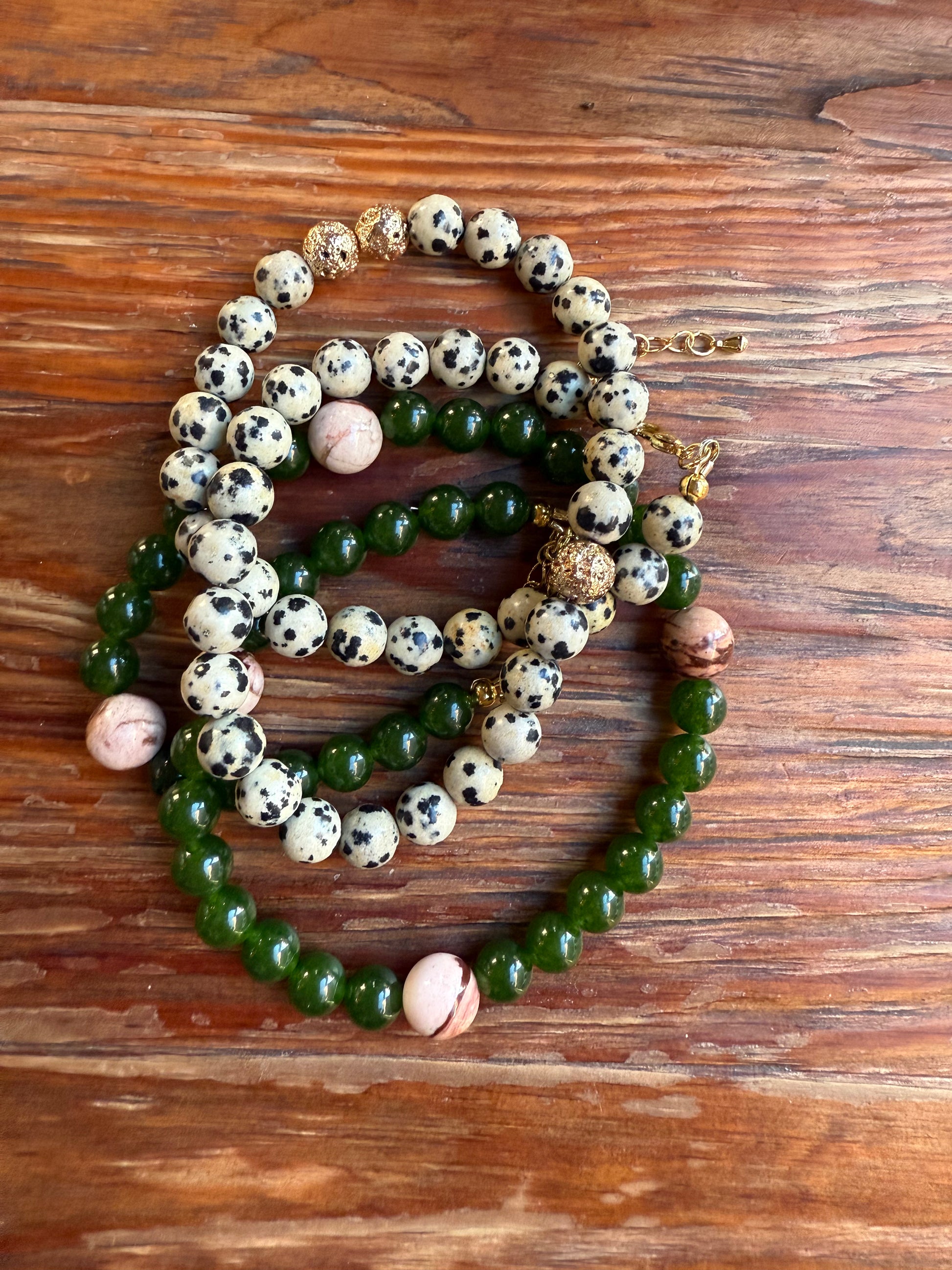 Subtelny naszyjnik z zielonego awenturynu/ tonowanego kwarcu oraz różowej jaspisu. Harmonijne połączenie głębokiej zieleni z ciepłymi, pudrowymi tonami tworzy biżuterię inspirowaną naturą, spokojem i równowagą.