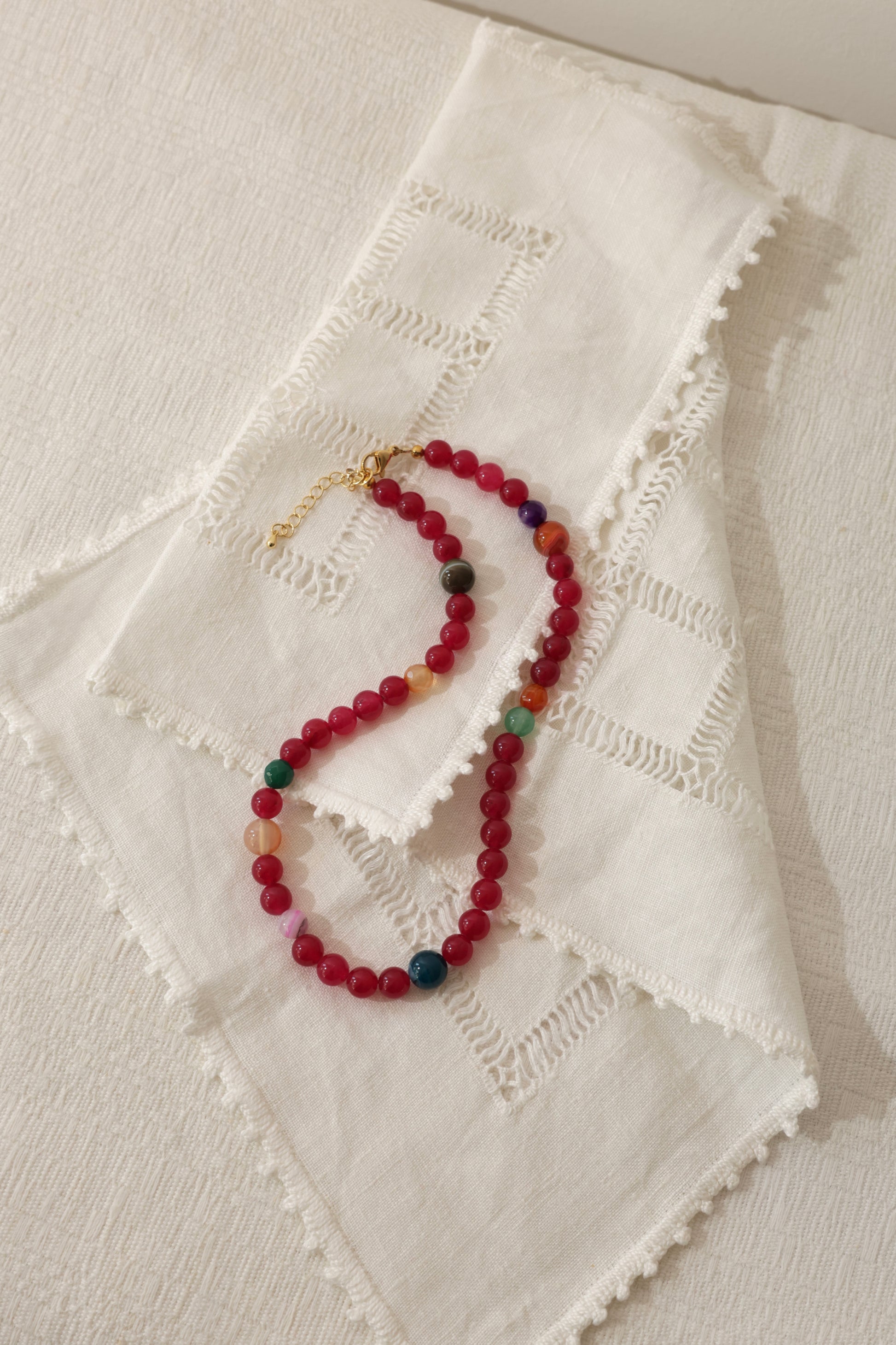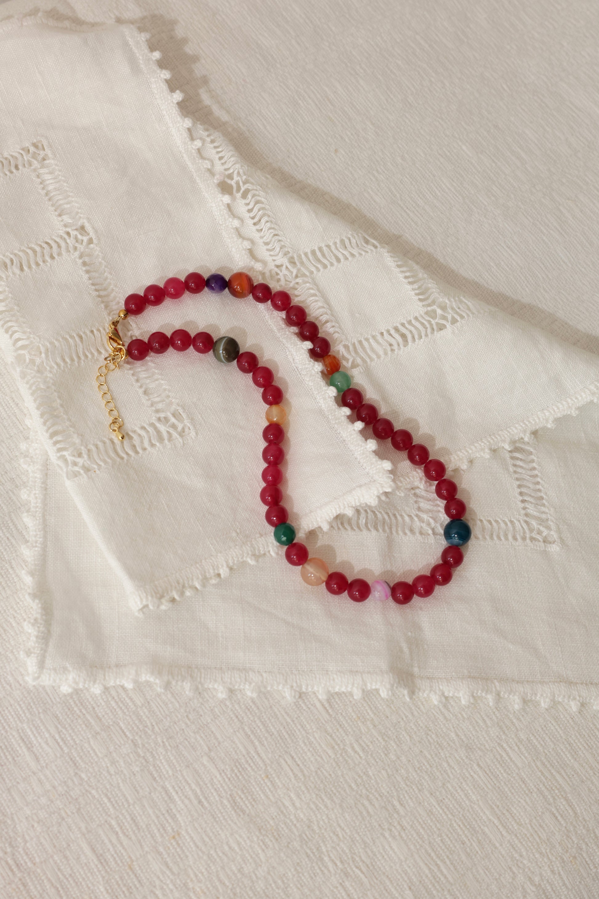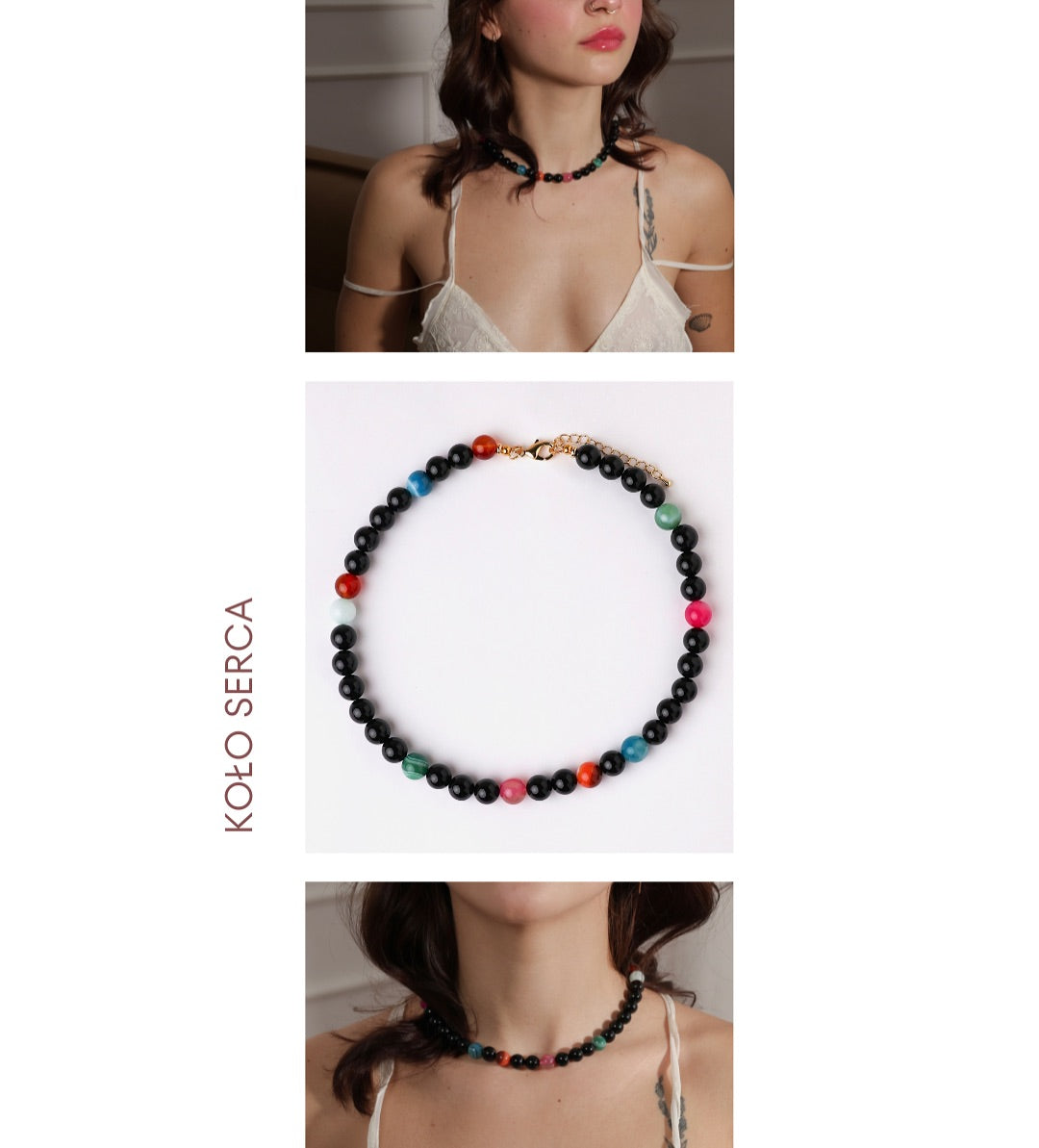 Naszyjnik pięknie układa się na szyi i sprawdzi się zarówno w codziennych stylizacjach, jak i jako oryginalny dodatek do wyjątkowych okazji. Naturalne kamienie mogą nieznacznie różnić się kolorem i fakturą – to czyni każdy egzemplarz unikalnym.