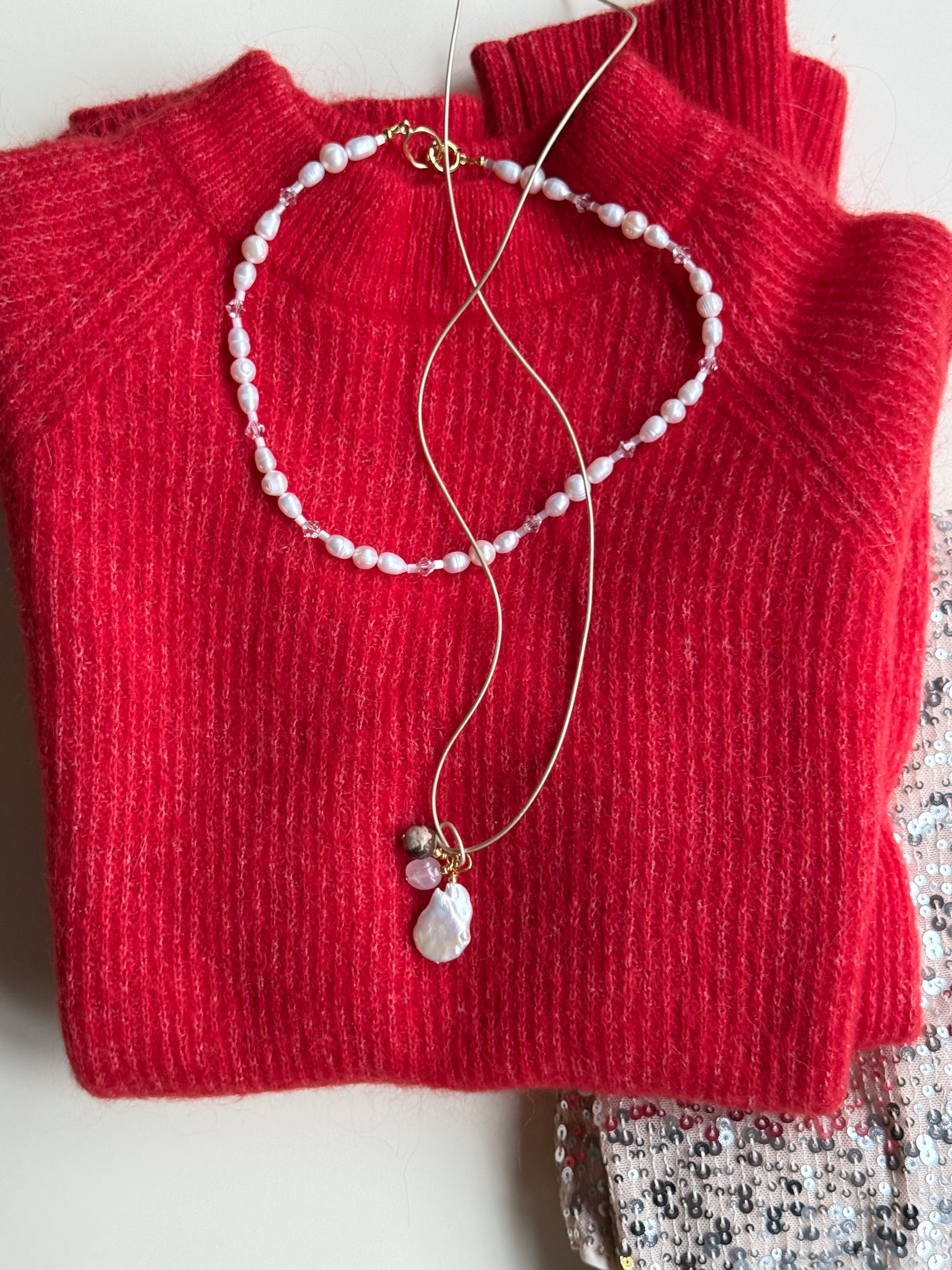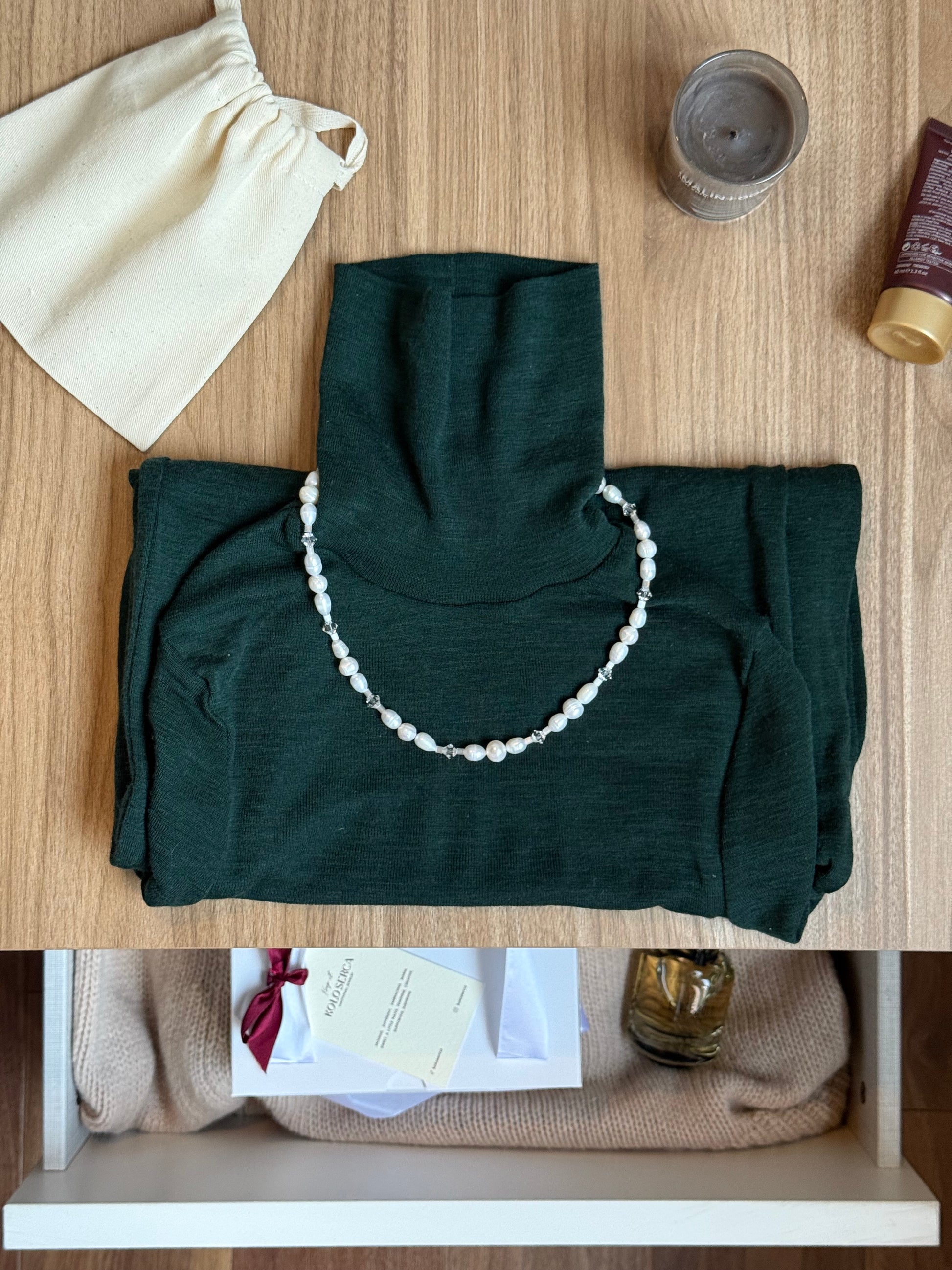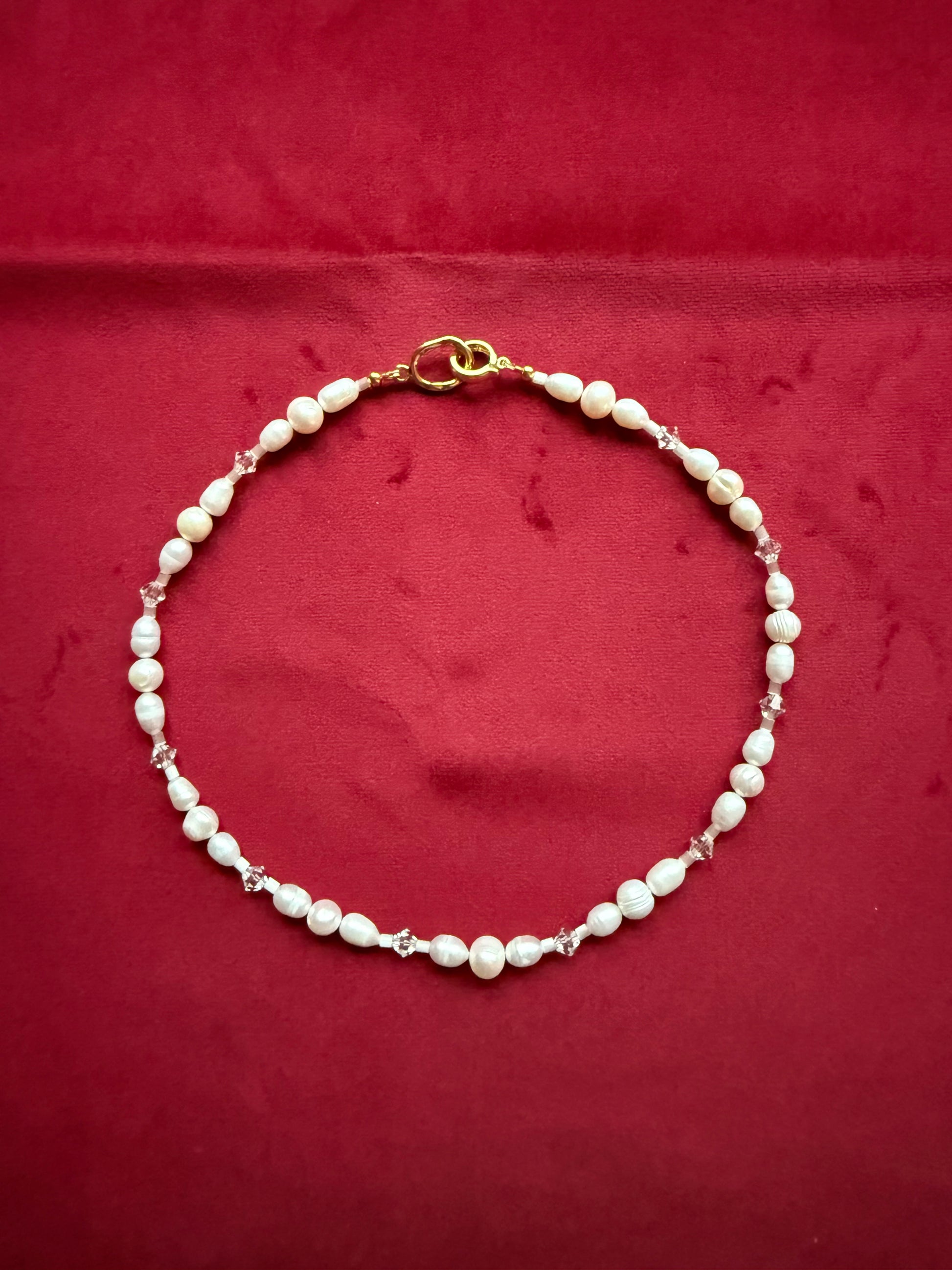 Delikatny, kobiecy i ponadczasowy — naszyjnik łączy w sobie naturalne perły, czeskie kryształki, japońskie koraliki Miyuki oraz pozłacaną zapięcie.