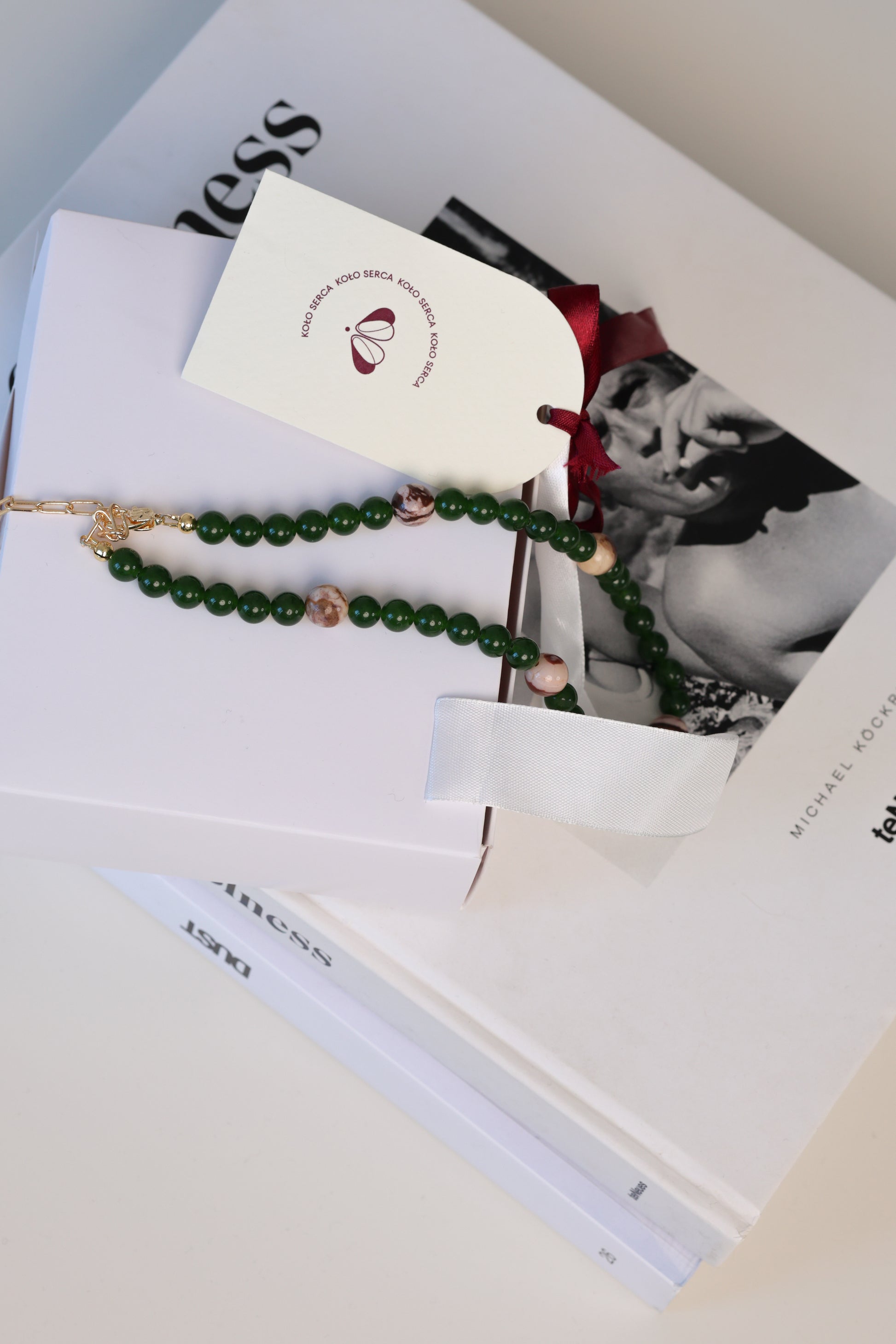 Każdy naszyjnik zapakowany jest w bawełniany woreczek z logo Koło Serca oraz ozdobne pudełko prezentowe z kartą opowieści o kolekcji.