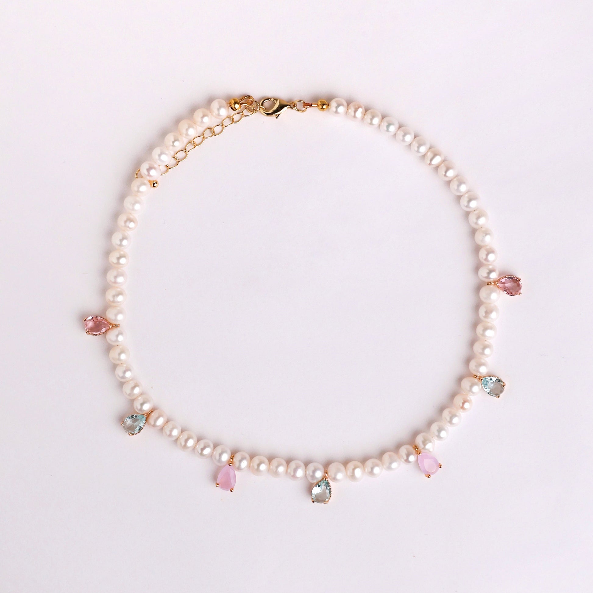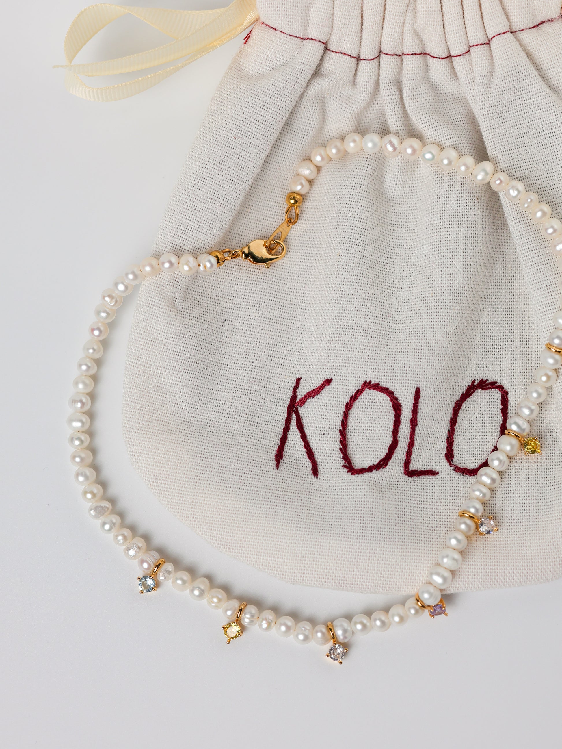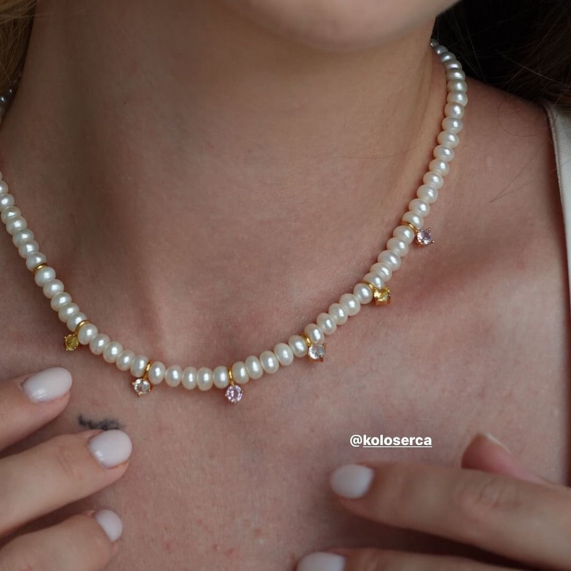 Delikatny naszyjnik wykonany ręcznie z naturalnych pereł słodkowodnych w odcieniu kości słoniowej, uzupełniony zawieszkami z cyrkoniami w pozłacanych oprawach. To biżuteria, która łączy w sobie szlachetną prostotę i nowoczesny detal – idealna na co dzień i na wyjątkowe okazje.