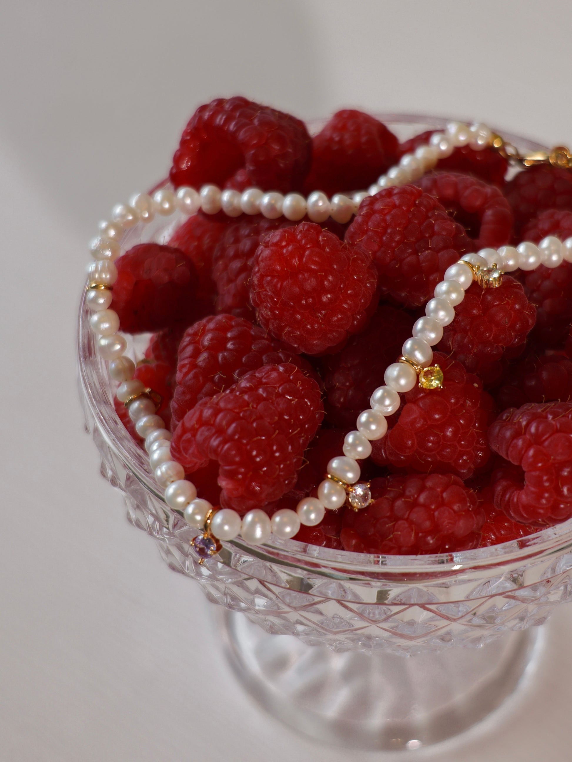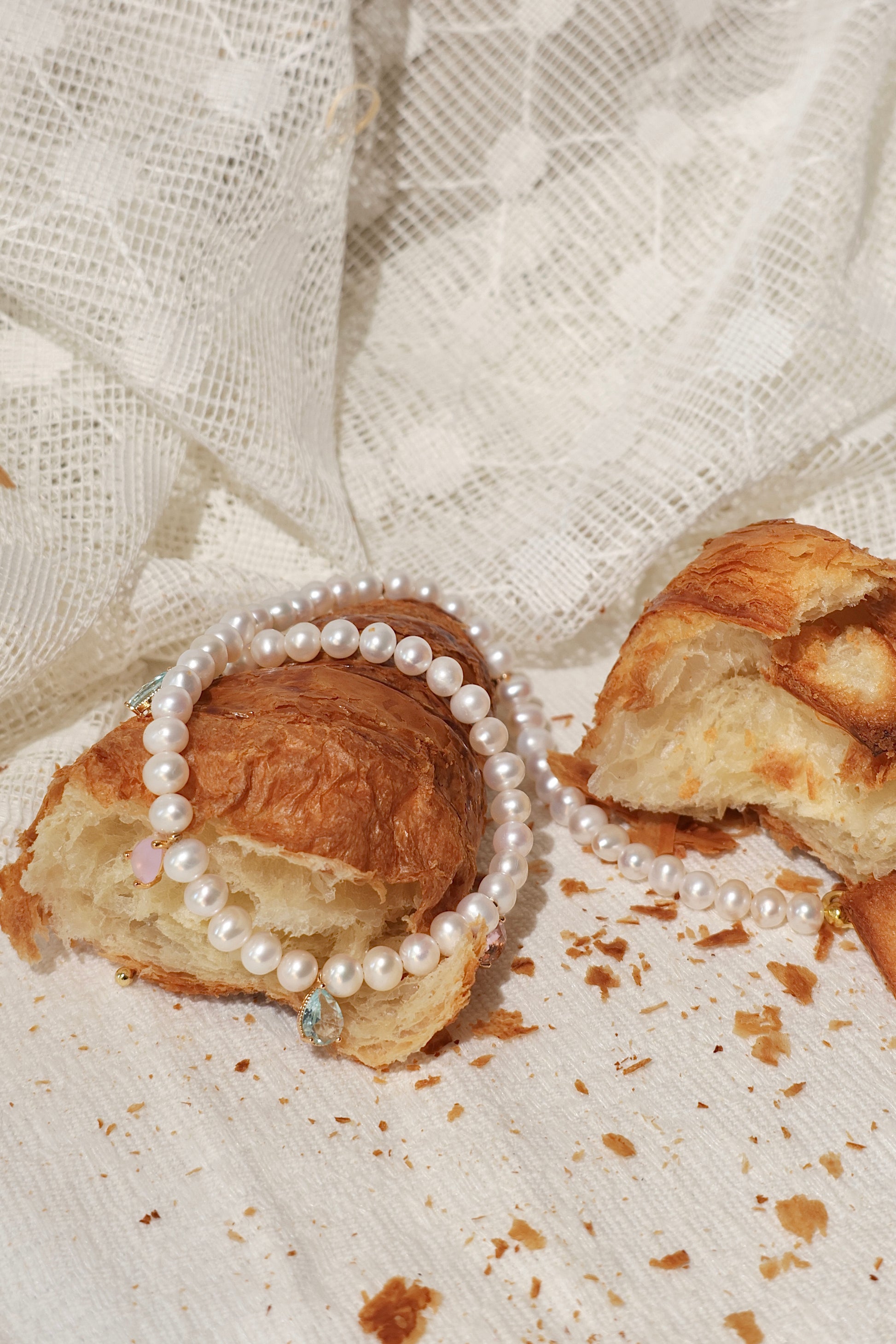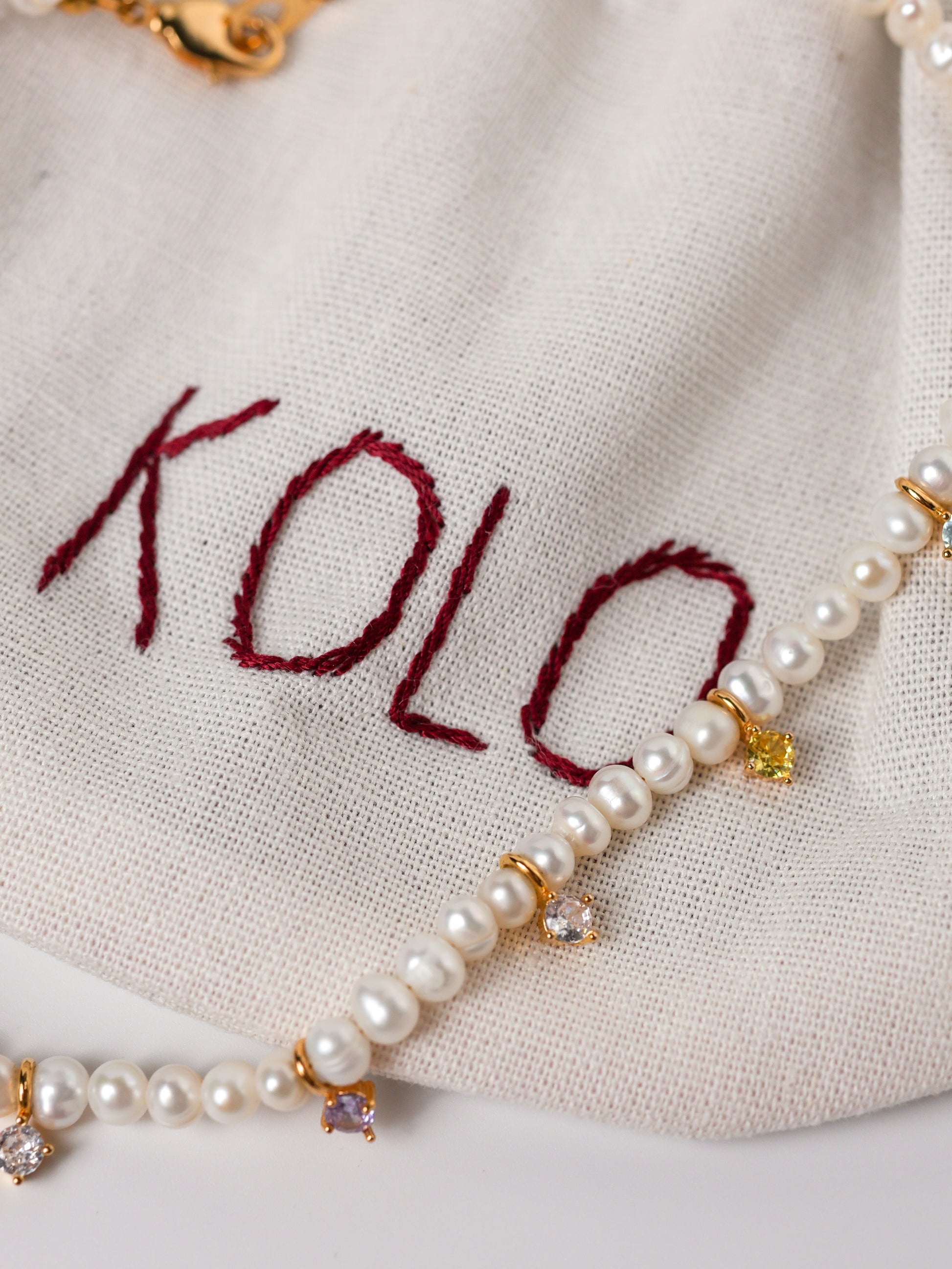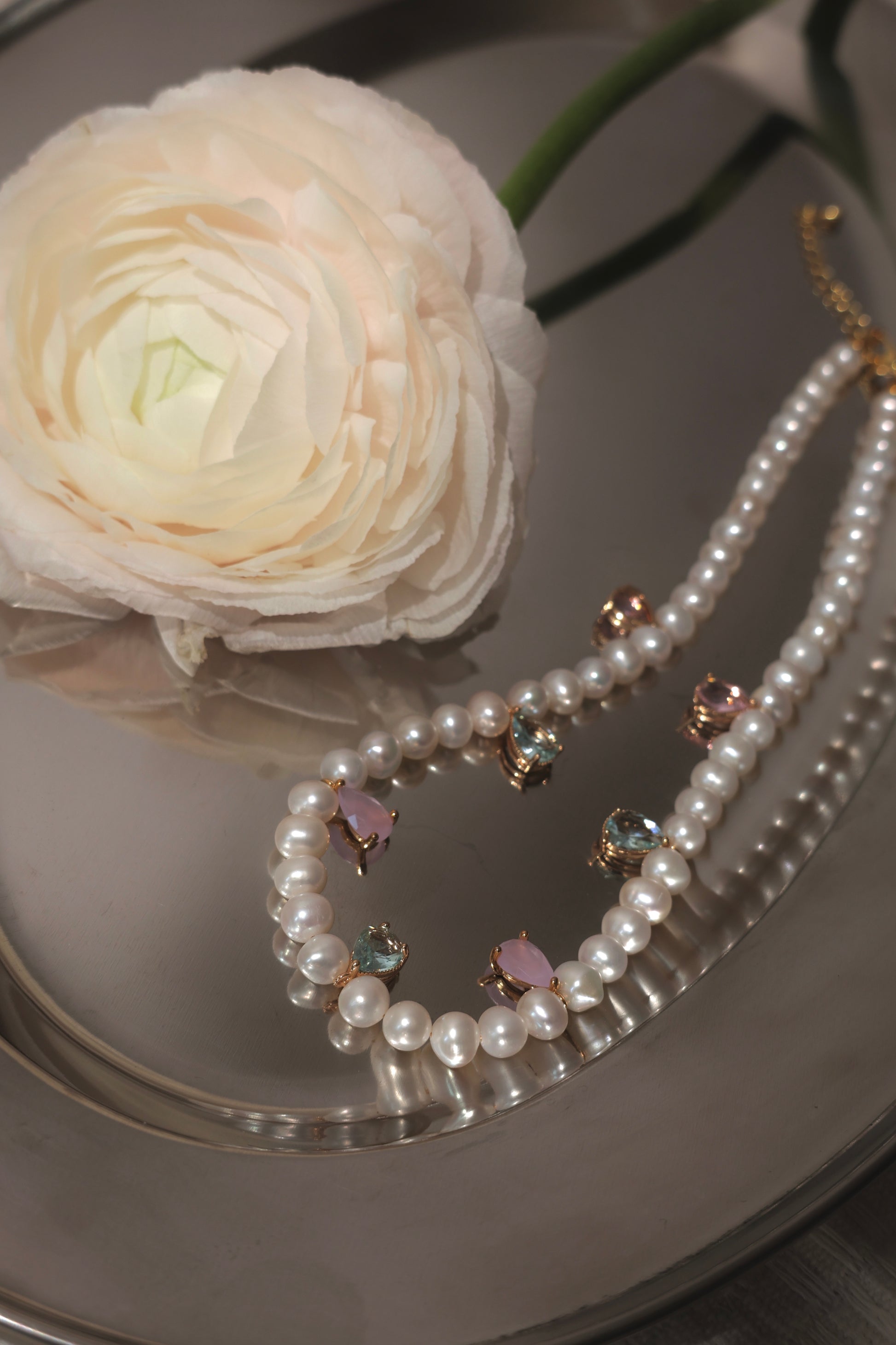 Delikatny naszyjnik wykonany ręcznie z naturalnych pereł słodkowodnych w odcieniu kości słoniowej, uzupełniony zawieszkami z cyrkoniami w pozłacanych oprawach. To biżuteria, która łączy w sobie szlachetną prostotę i nowoczesny detal – idealna na co dzień i na wyjątkowe okazje.