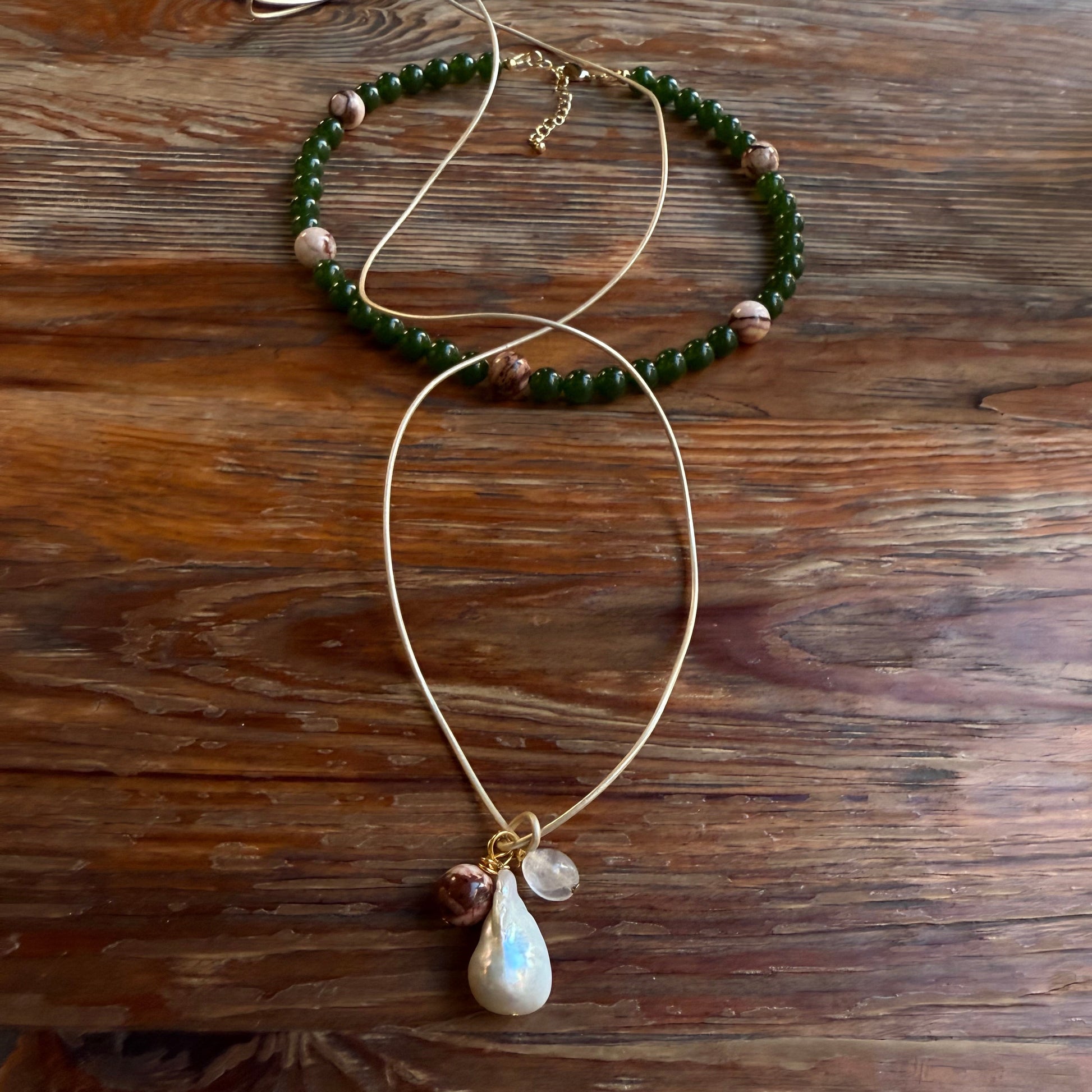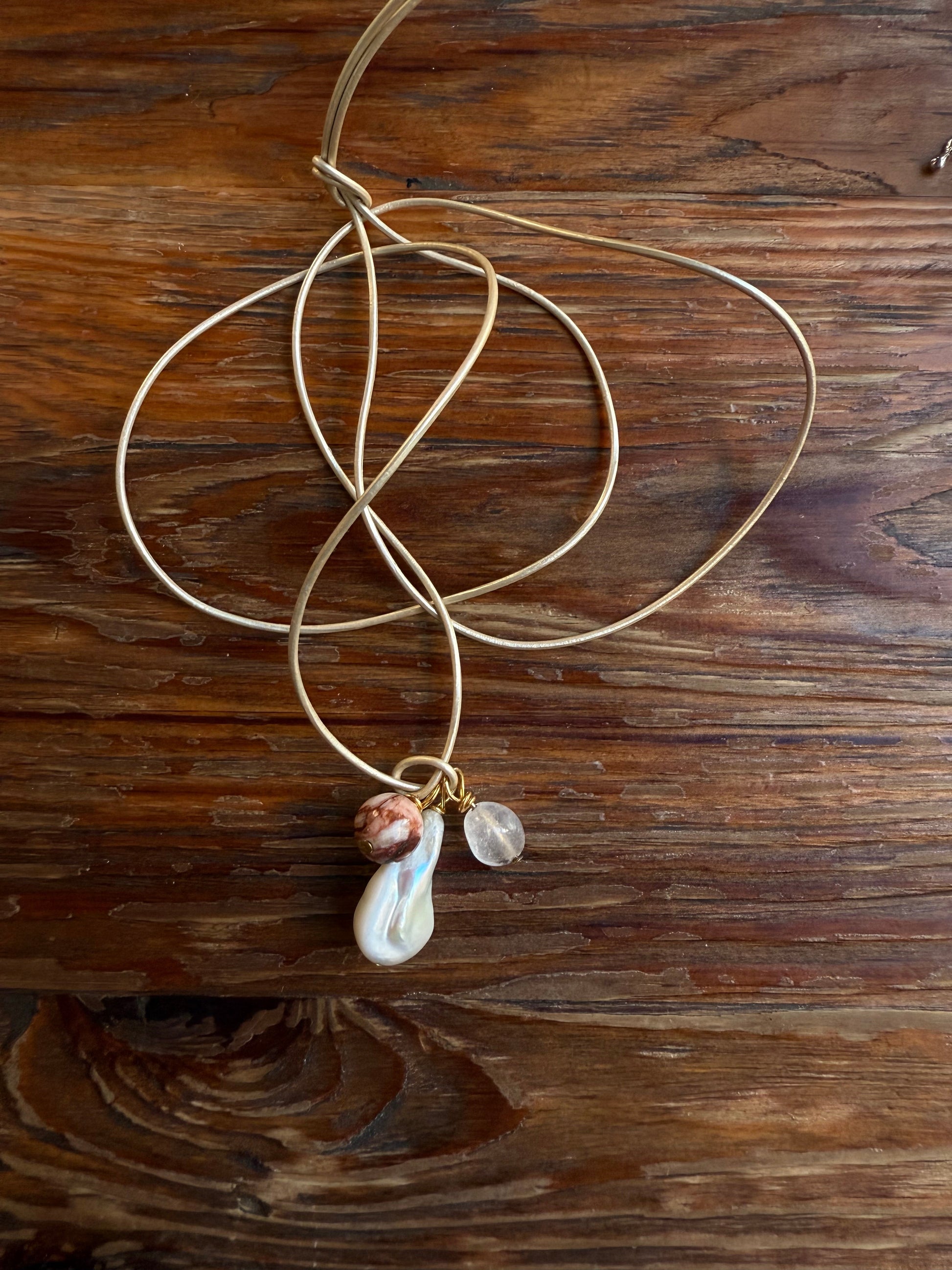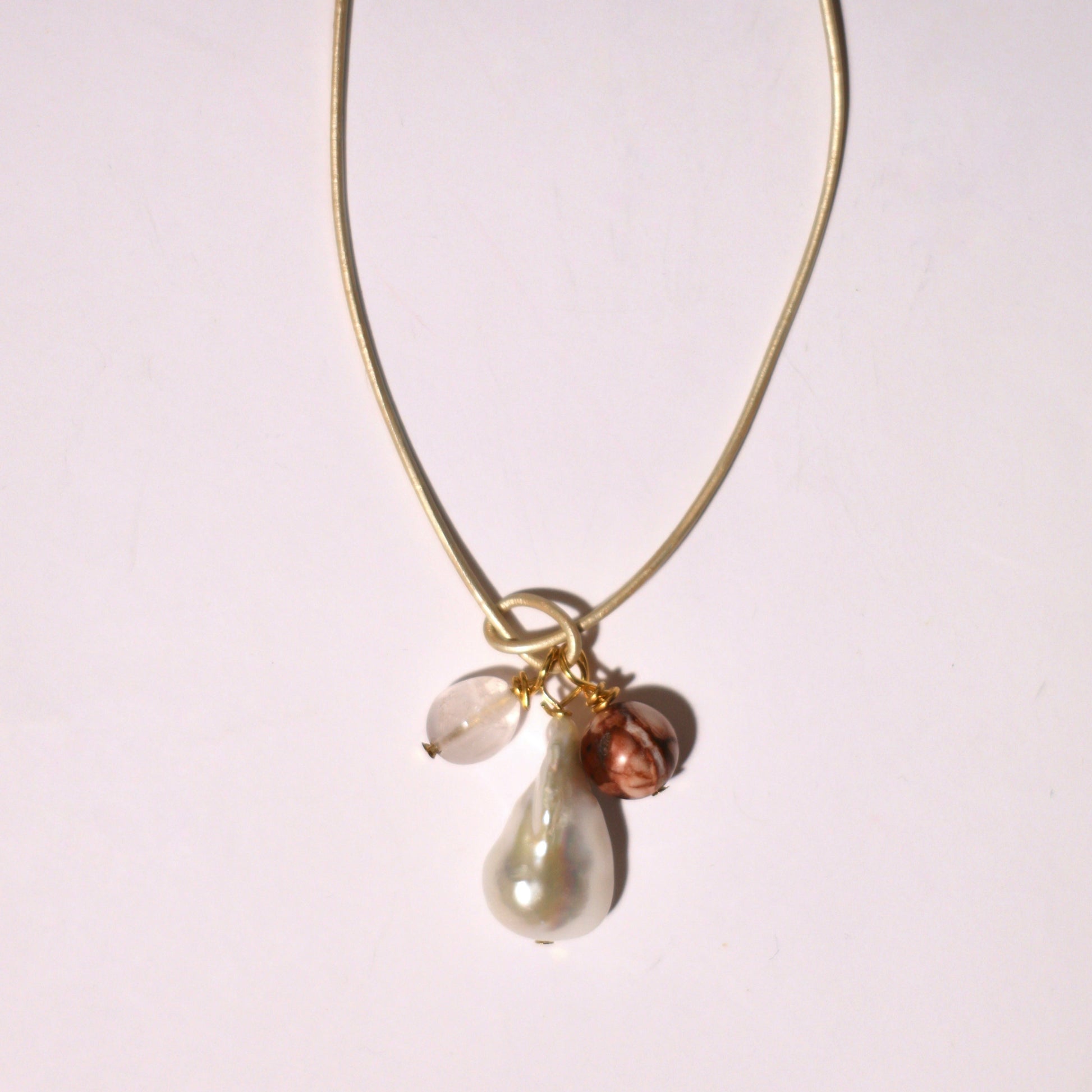 Delikatny i pełen światła — ten naszyjnik łączy barokową perłę o organicznej formie z mieszanką naturalnych kamieni w odcieniach różu i miedzi.