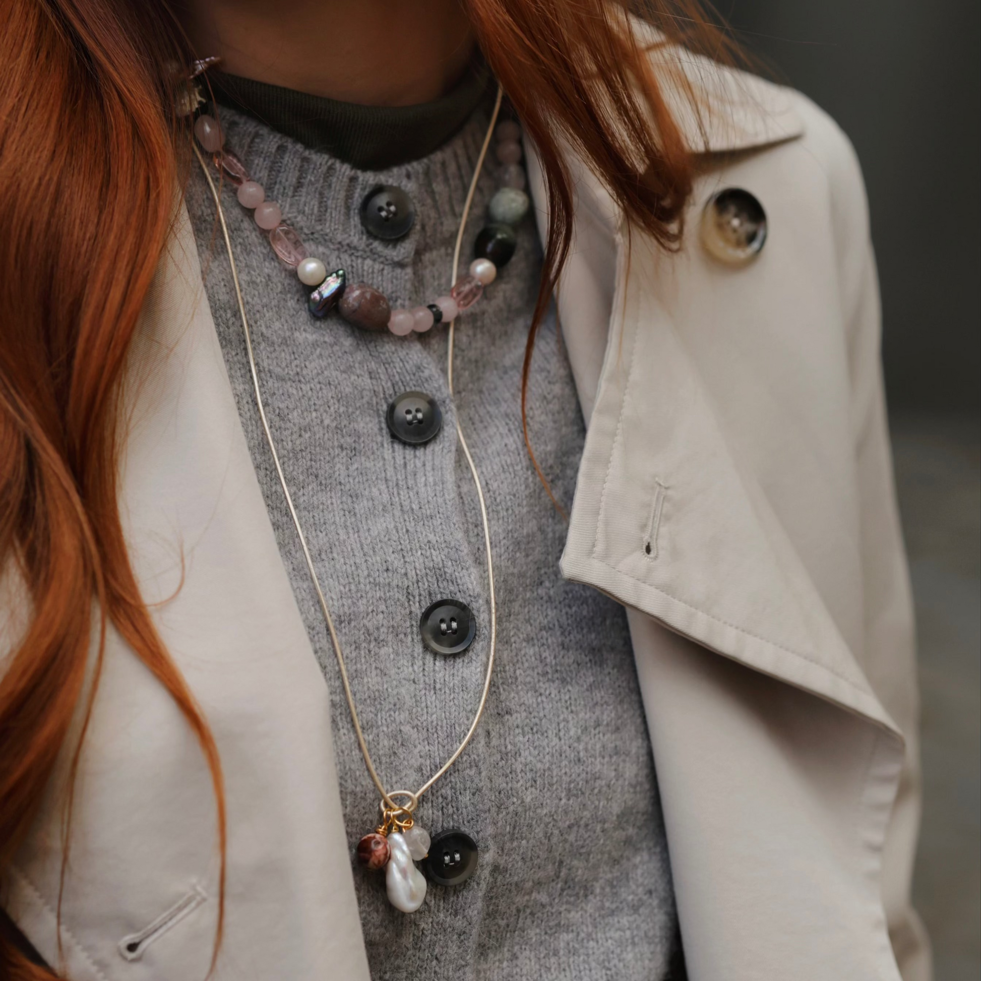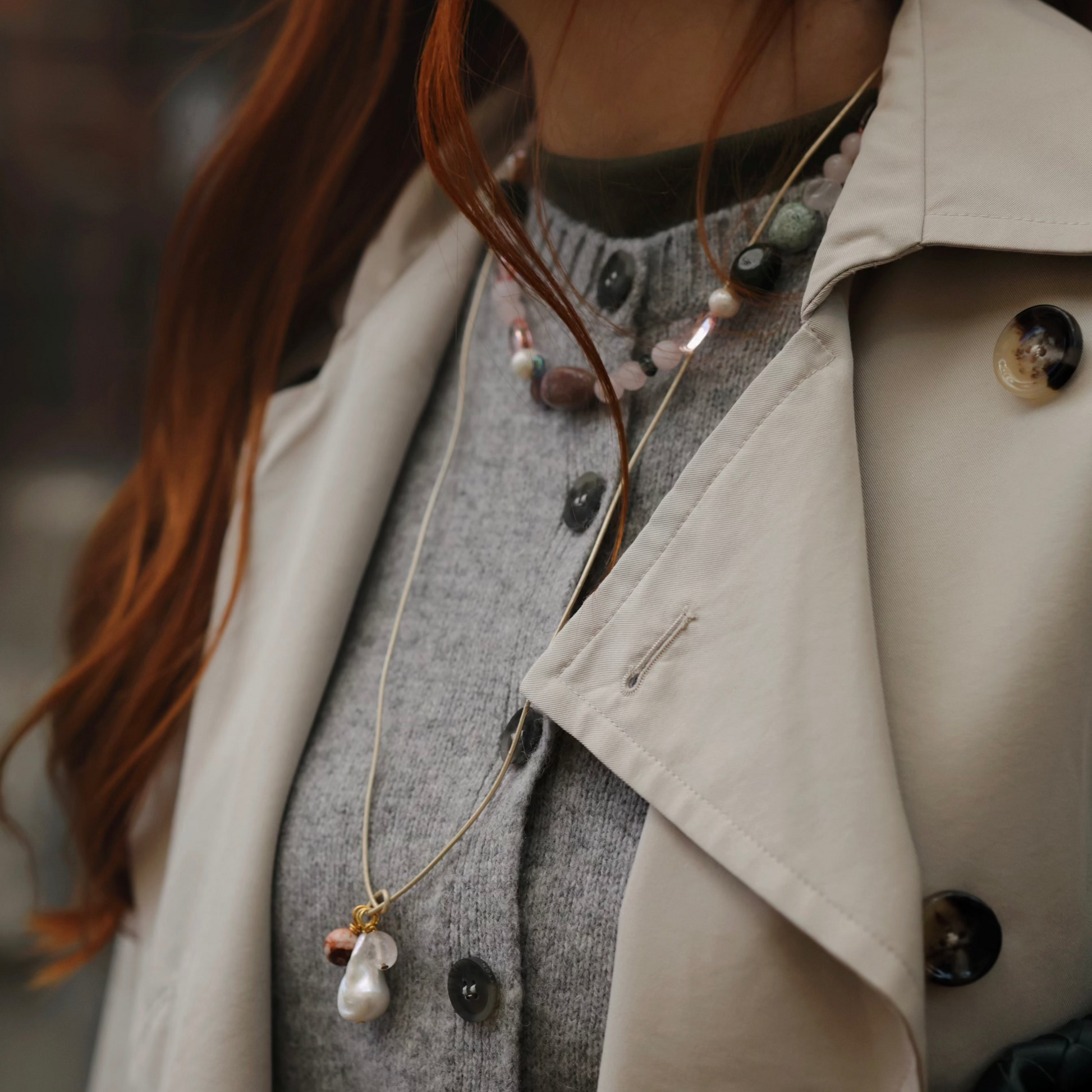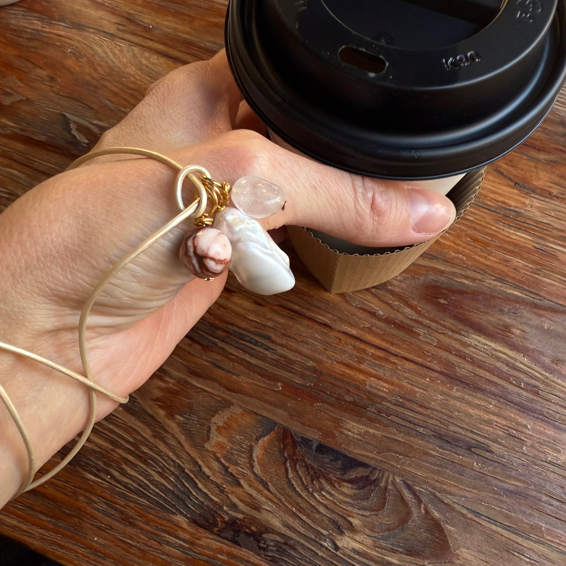 Delikatny i pełen światła — ten naszyjnik łączy barokową perłę o organicznej formie z mieszanką naturalnych kamieni w odcieniach różu i miedzi.