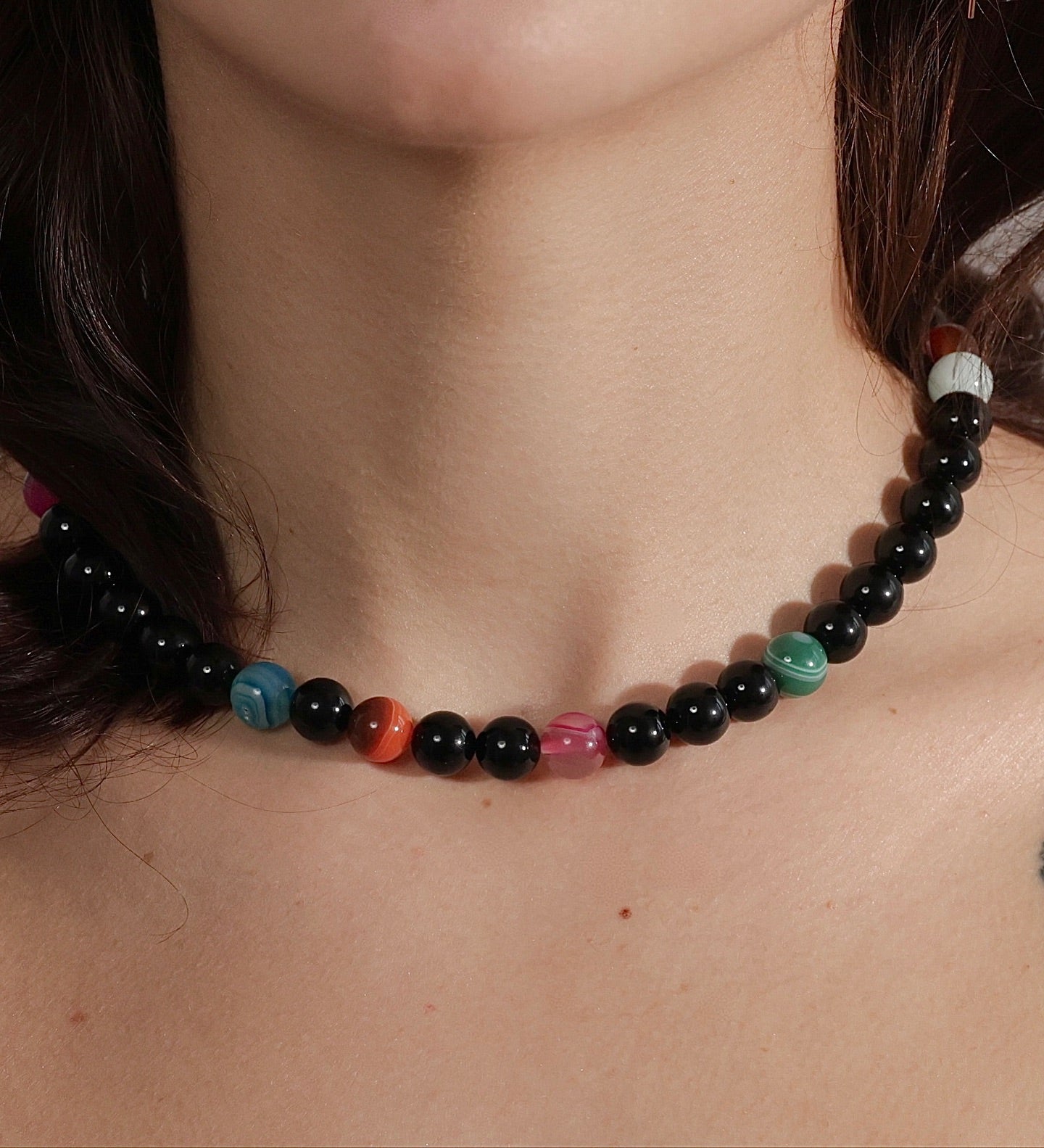 Ręcznie wykonany naszyjnik z czarnego onyksu i miksu drobnych koralików z naturalnych agatów to propozycja dla osób ceniących biżuterię o wyjątkowym charakterze. Głęboka czerń onyksu spotyka się tu z wielobarwnością kamieni, tworząc nowoczesne, a zarazem ponadczasowe połączenie.
