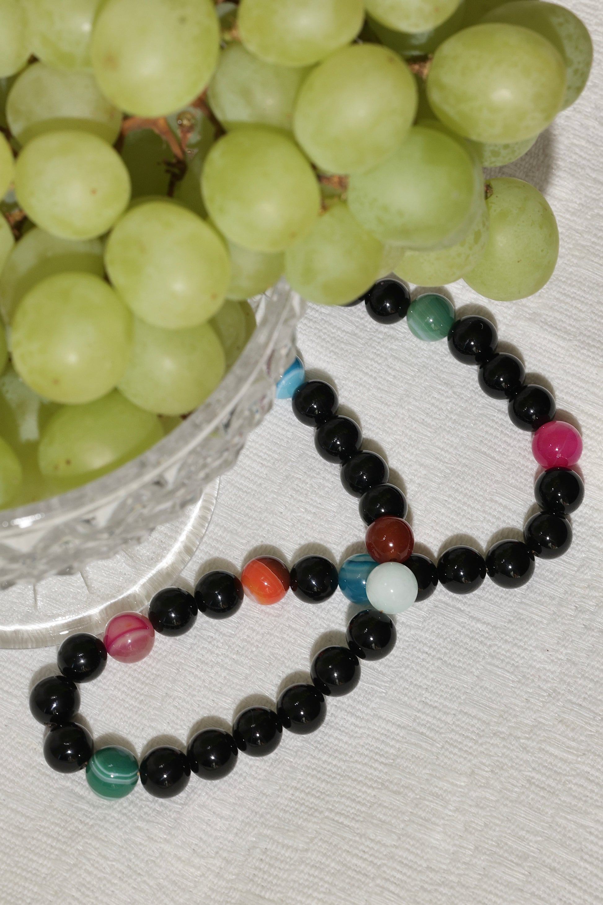 Skład: czarny onyks, naturalne agaty (miks kolorów i kształtów)