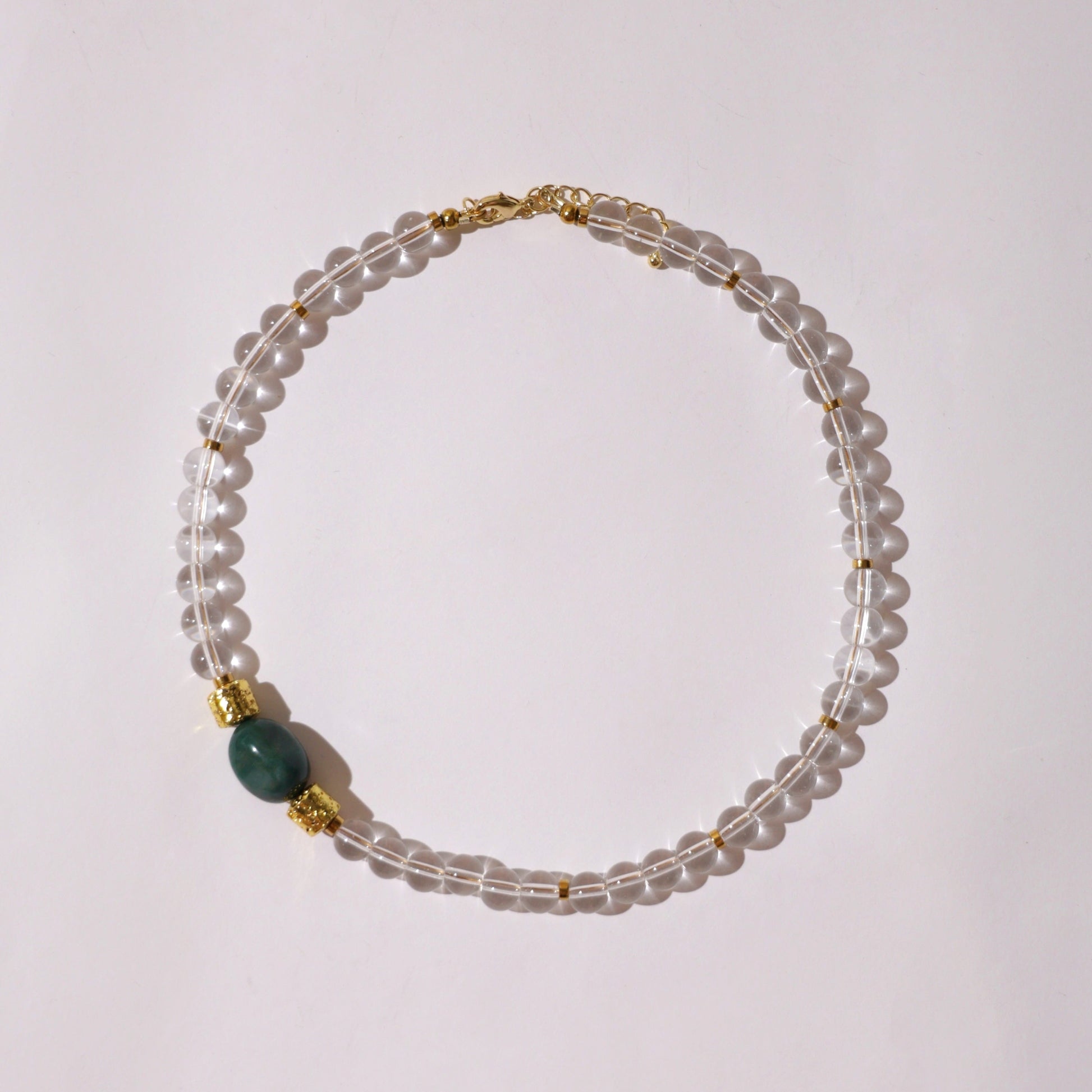 Przezroczysty kryształ górski symbolizuje klarowność i światło, zielony jaspis — siłę natury i równowagę, a pozłacana lawa wulkaniczna dodaje całości ciepłego, słonecznego akcentu.