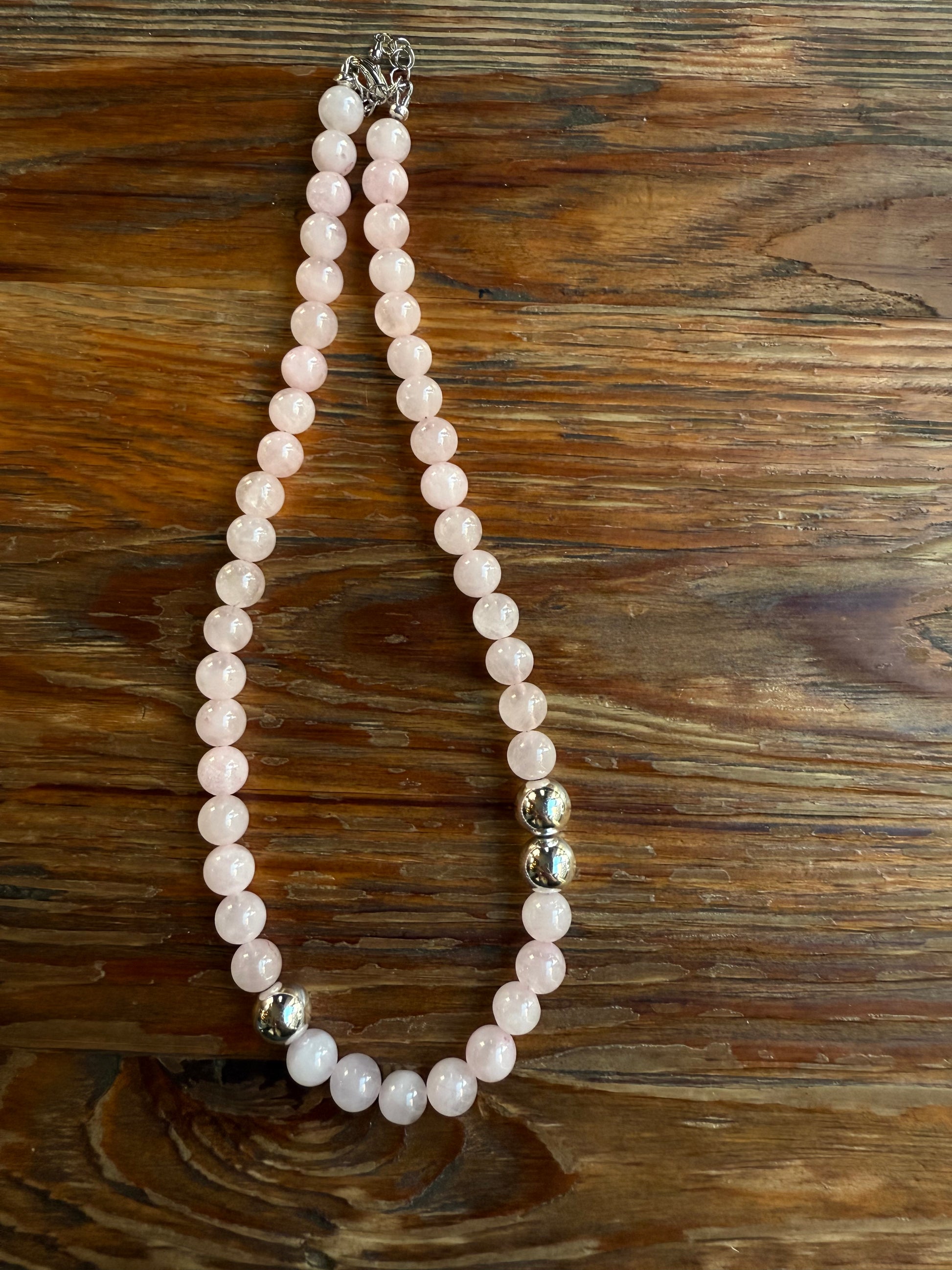 Naszyjnik z różowego kwarcu i posrebrzanego hematytu