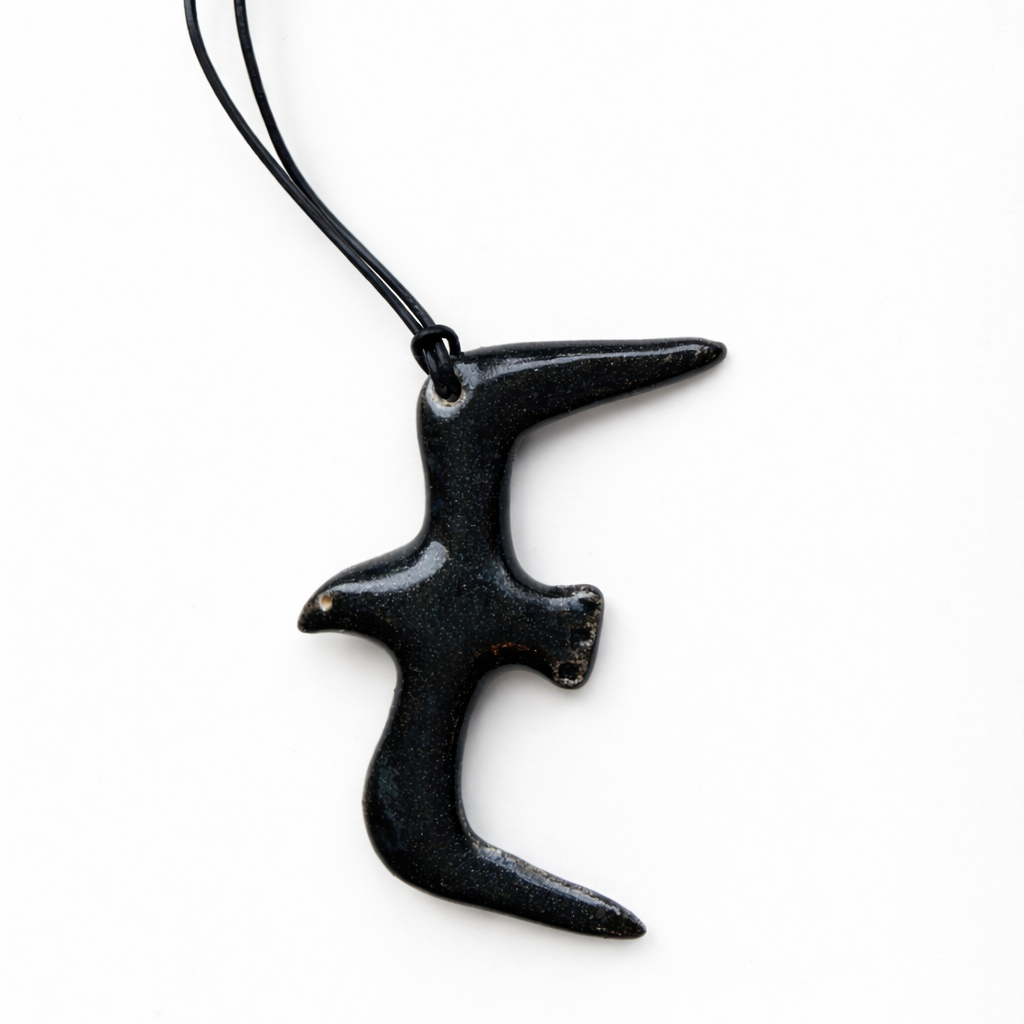 Ta ceramiczna zawieszka w kształcie mewy to egzemplarz testowy (sample) w czarnym kolorze, z delikatną, ziarnistą strukturą glazury. Forma jest uproszczona i dynamiczna — inspirowana ruchem, wolnością i naturą.