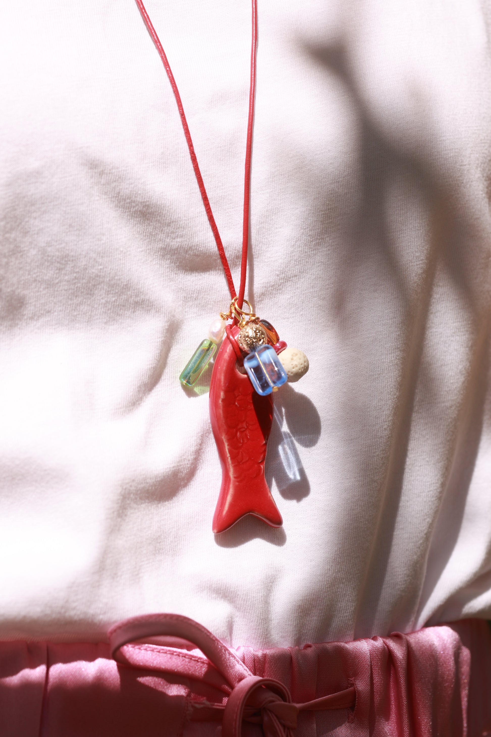 Ręcznie wykonana zawieszka w kształcie rybki z ceramiki w intensywnym czerwonym kolorze. Rybka to symbol intuicji, ochrony i wewnętrznej wolności – w tej wersji ożywiona barwą, która przyciąga spojrzenia i dodaje mocy.
